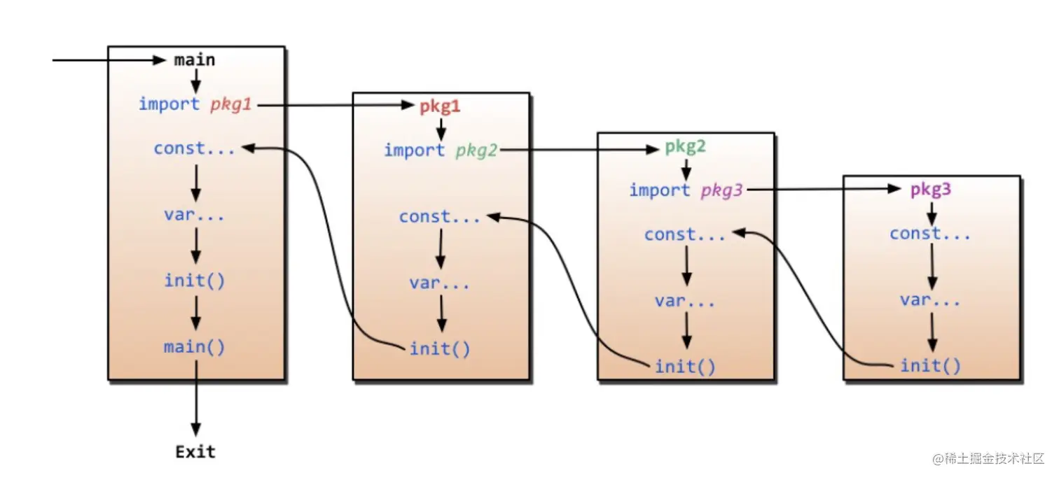 - 不同包的init函数按照包导入的依赖关系决定该初始化函数的执行顺序。