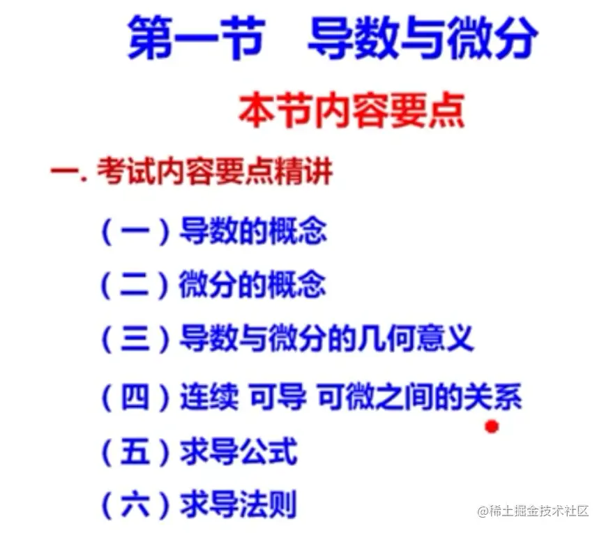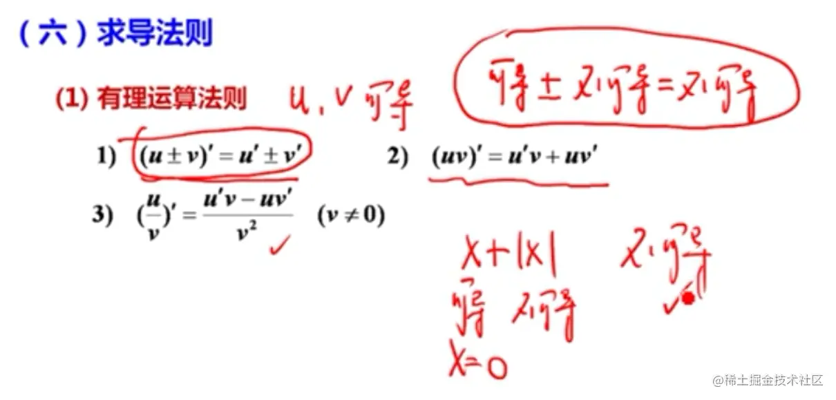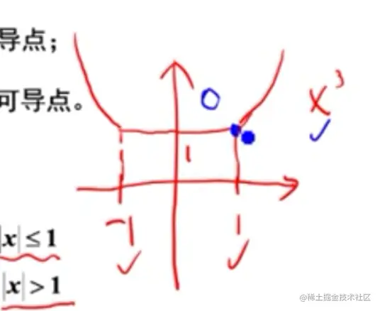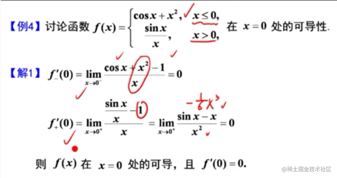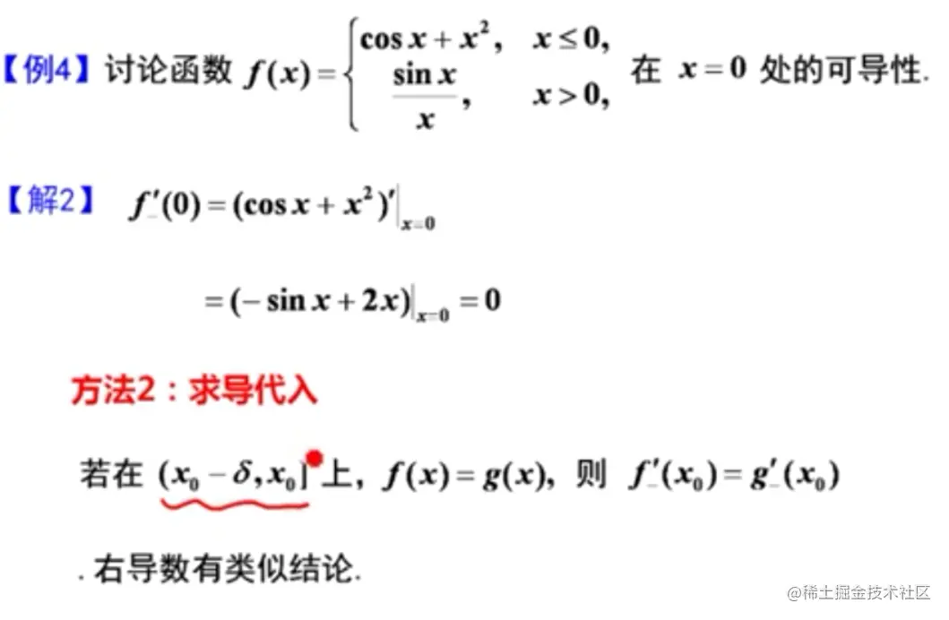 - 有定义的点可用导数公式直接求(比如左半部分的求导),无定义的点可用定义求导数(比如右半部分的求导)