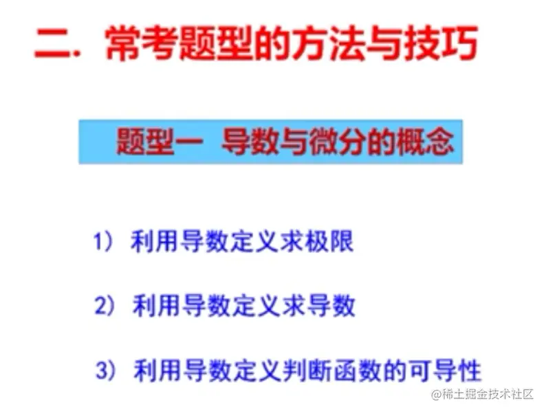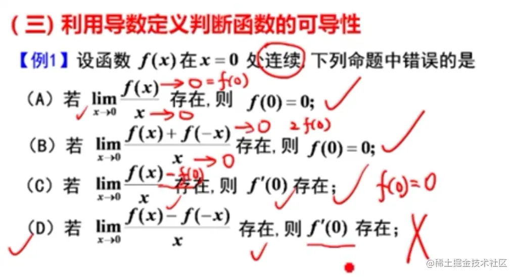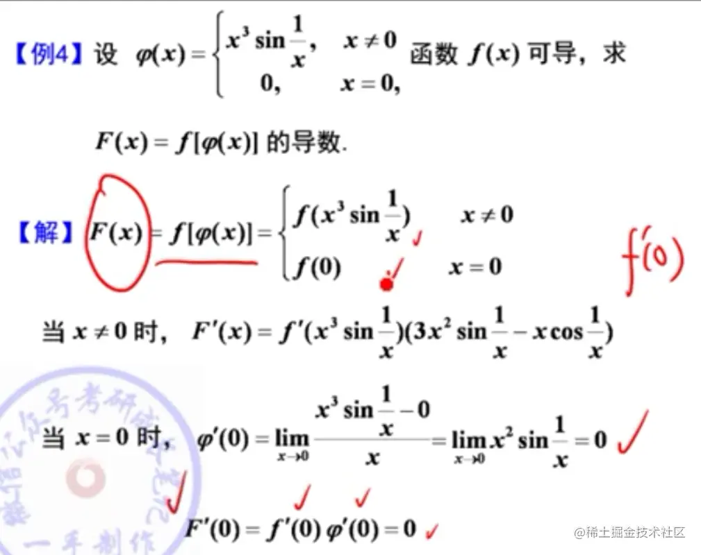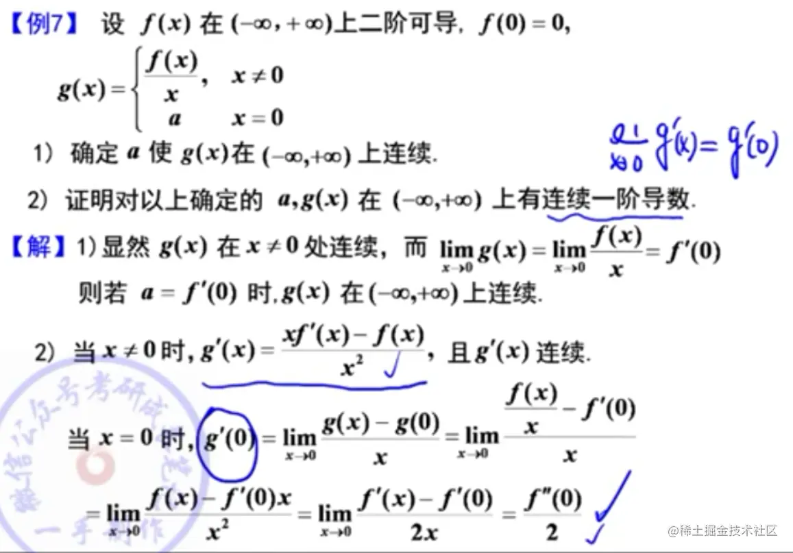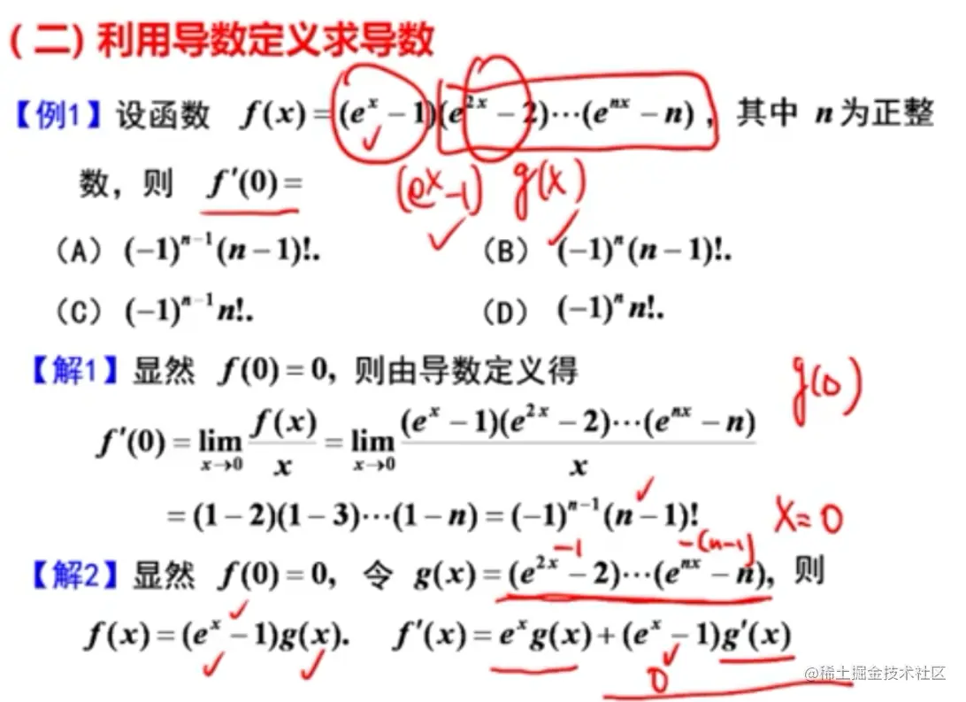 - 注意个别题不是分段函数,但是导函数在某些点无定义,所以要单独求那个点的导数,比如:李正元例2.7(Ⅱ)
