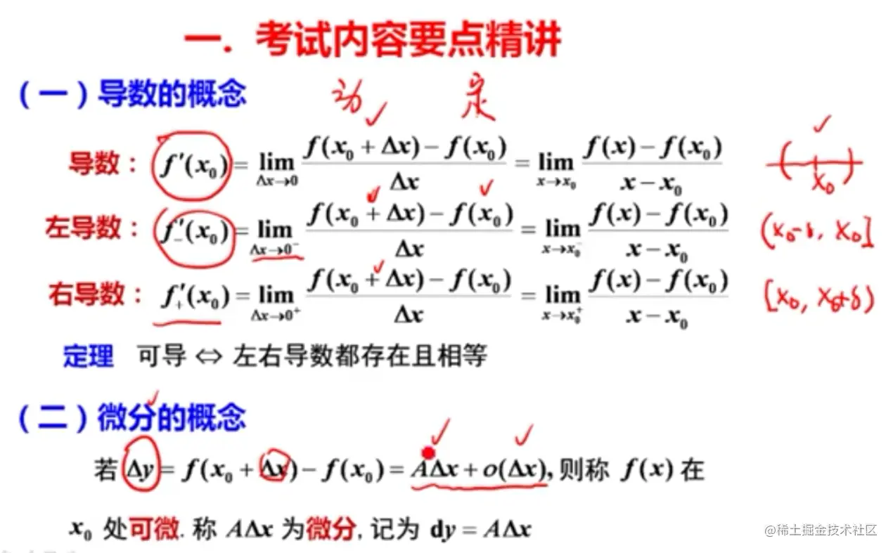 - 左右有别,左和右分别只能确定左右导数,左右导数存在且相等才能说有导数