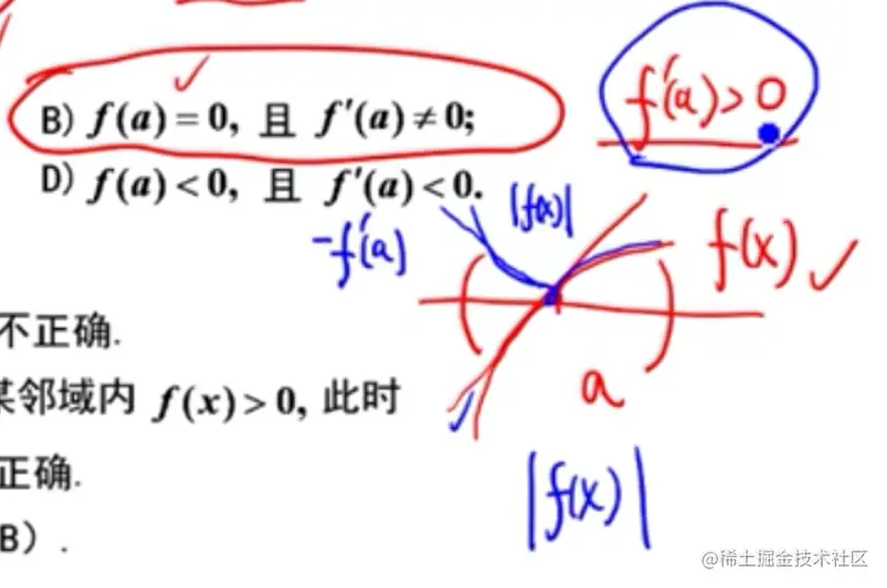 - 从几何意义来看,B项不妨令,则有左半邻域内,右半邻域内,所以在这点会有尖点(利用前面讲的某个点导数大于0的结论)
