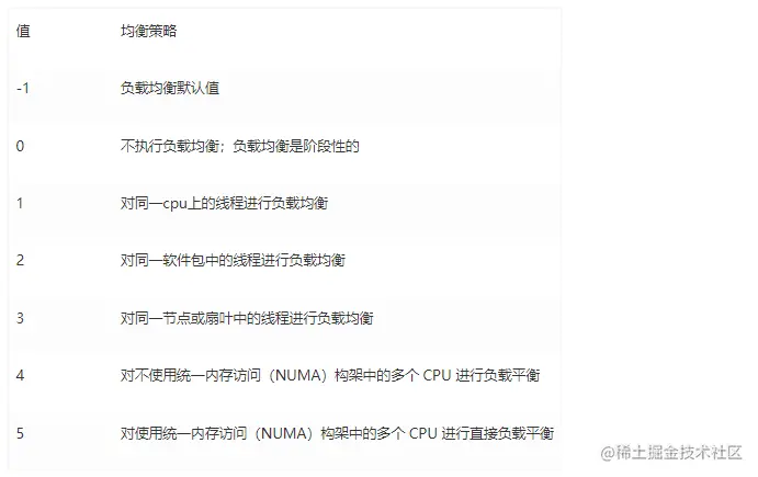 表示内核进行负载均衡的策略,如果禁用负载均衡则该值无意义。不同系统框架下,该值意义可能不同,以下为常用值的含义: