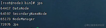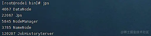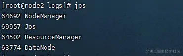 之后在node1运行 sbin/start-dfs.sh,这里有一点要注意的是sbin/start-yarn.sh需要在配置了ResourceManager的节点进行启动,也就是node2里面启动。启动完成后可以看到对应的进程。