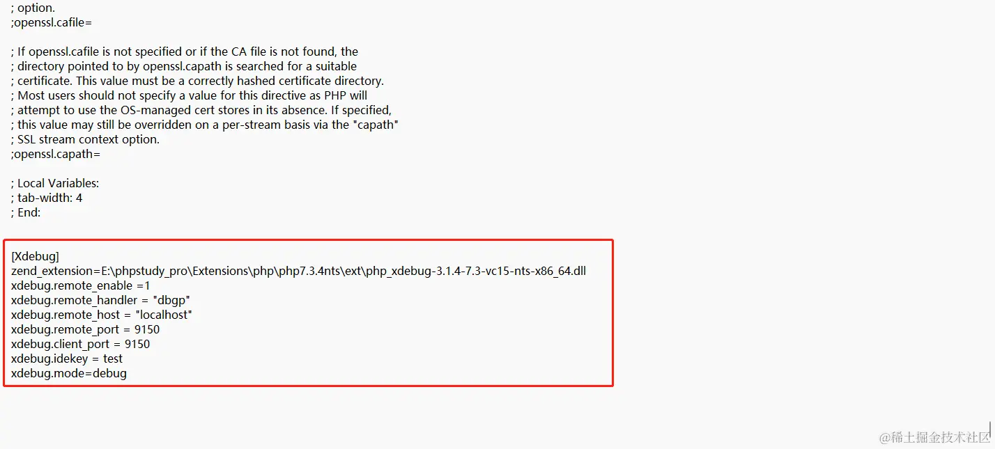 - 打开 php.ini 文件,在最下方增加 xdebug 扩展配置
