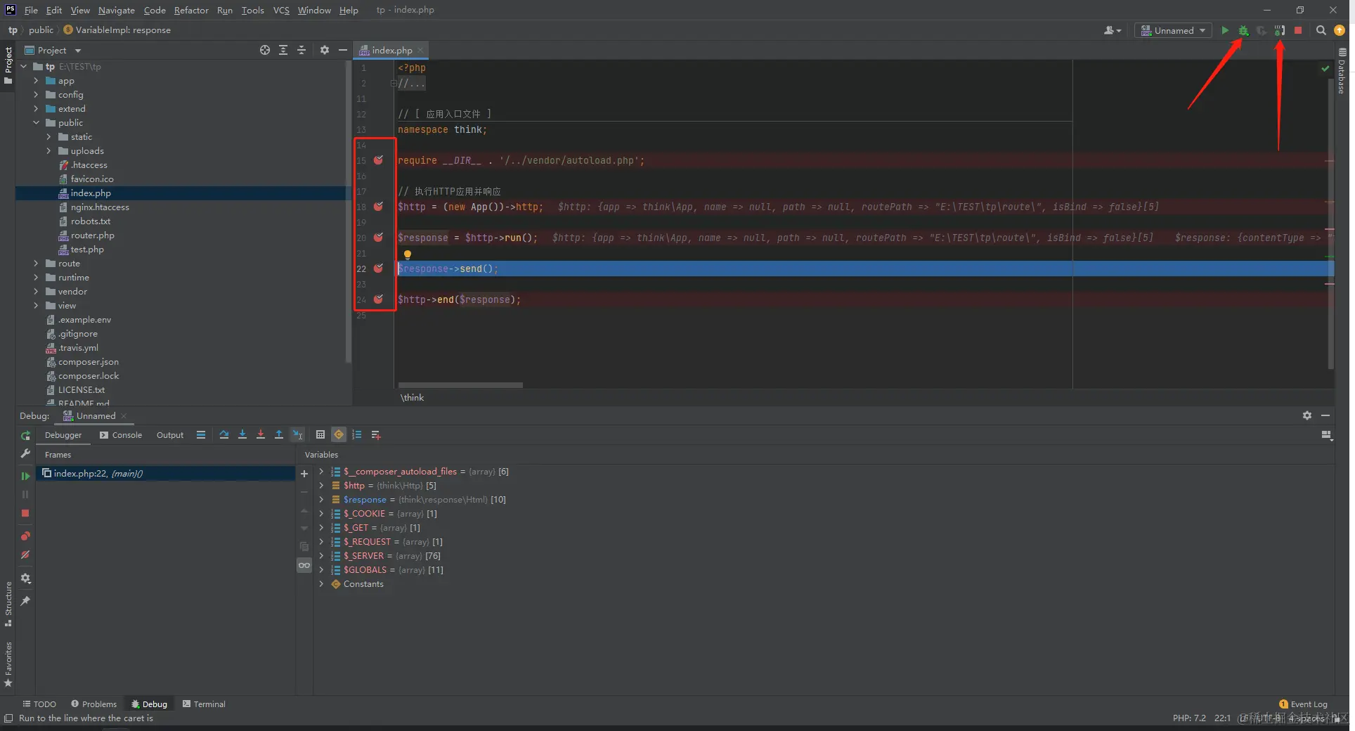 - 设置断点,开启 debug 监听,点击绿色的甲壳虫进行开始调试,这个小电话一定的是接通的状态,才可以的。