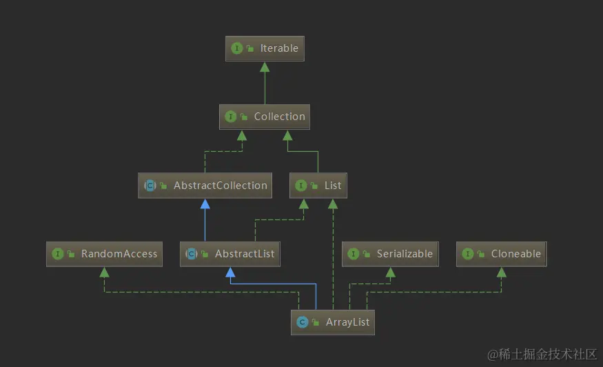 从结构图上可以看到ArrayList是抽象类AbstractList的子类【AbstractList是一个模版类,add(),remove()等默认的操作】,同时实现了List接口【list 顶层接口,主要定义了List 的一些操作,如:size(),isEmpty(),contains(),iterator()】。除此之外,它还实现了三个标识型接口,这几个接口都没有任何方法,仅作为标识表示实现类具备某项功能。