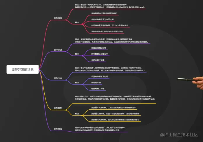 大家不要被表面的文字所迷惑,不管是缓存雪崩、缓存穿透还是缓存击穿,都是指缓存失效或者异常,导致访问压力流转到数据库,从而使得数据库负载过高。那么缓存异常的场景还有缓存预热异常、缓存降级异常等等,我总结了一张脑图供大家参考和学习,有需要的小伙伴可以关注我的主页介绍。