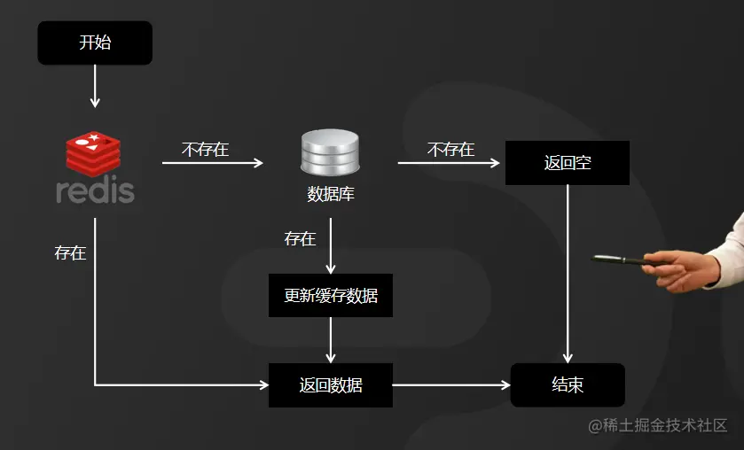 一般情况下,1.用户请求到后台,会先从缓存中取数据,如果在缓存中取到数据,就直接返回结果,如果取不到数据就需要查询数据库,从数据库中取数据,从数据库中取到数据后会同步更新到缓存,并返回结果。下一个用户就可以直接从缓存中取值了。那如果在数据库也没有取到,就只能直接返回空结果。所以,缓存主要的作用就是缓解数据的负载压力,提升请求响应效率。