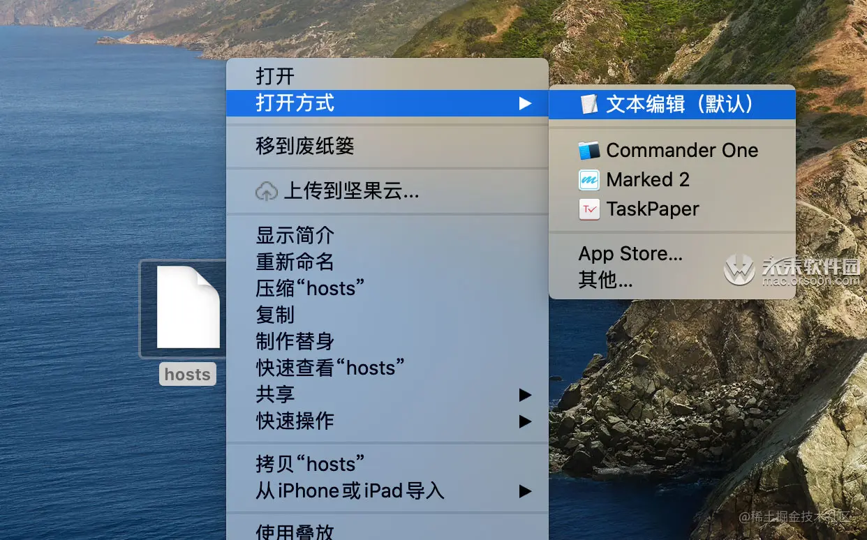 三、右键桌面上的hosts文件,滑动到【打开方式】,再点击【文本编辑】,如下图: