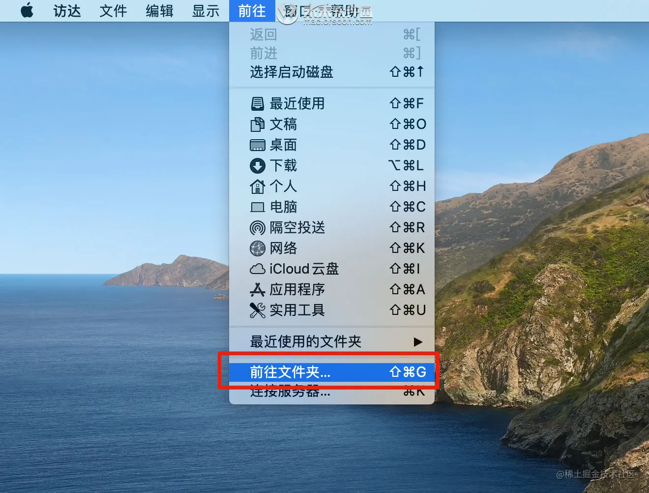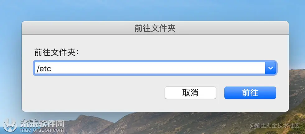 一、在桌面点击顶部菜单栏的【前往】,再点击【前往文件夹】,输入/etc,如下图: