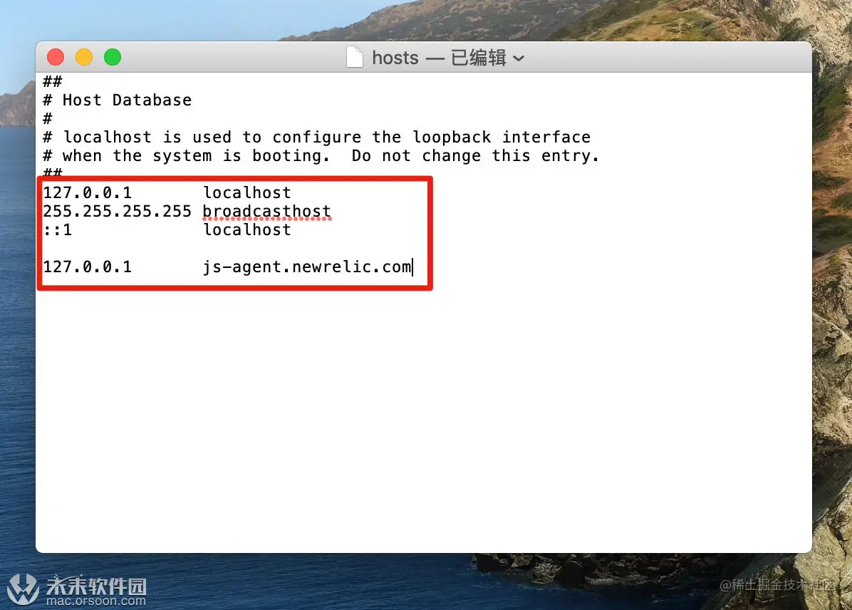 #号是注释,如下图红框中的是自定义的hosts内容,修改完按command + s保存。