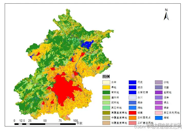 北京市土地利用数据产品是地理遥感生态网平台基于Landsat TM/ETM/OLI遥感影像,采用遥感信息提取方法,并结合野外实测,以及参照国内外现有的土地利用/土地覆盖分类体系,经过波段选择及融合,图像几何校正及配准并对图像进行增强处理、拼接与裁剪,将全国土地利用类型划分为6个一级类,25个二级分类以及部分三级分类的土地利用/土地覆盖数据产品。