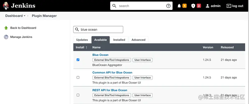 Blue Ocean 是 Jenkins 插件之一,在系统管理->插件管理,“可选插件” 中搜索 “Blue Ocean” 可以看到如下结果: