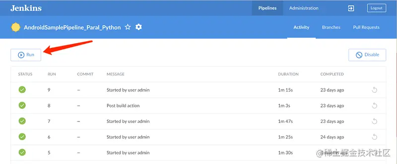 在 Blue Ocean 中打开 Pipeline 任务,单击 Run 按钮可以直接运行该任务。