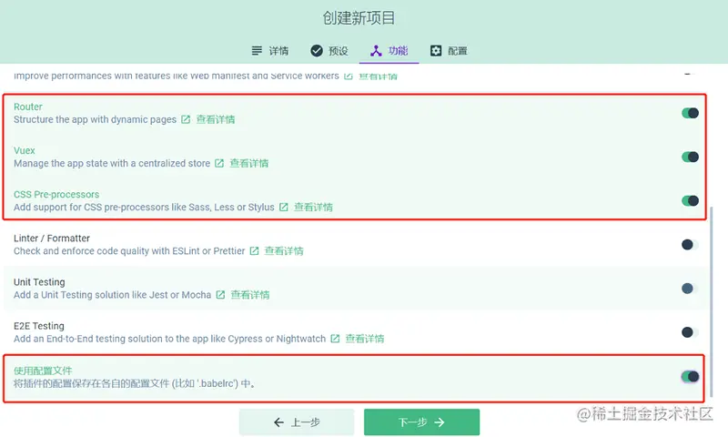 这里可以选择手动配置,选择自己需要的插件,当然也可以选择其他的选项。主要选择下面的这几个功能,点击下一步。\