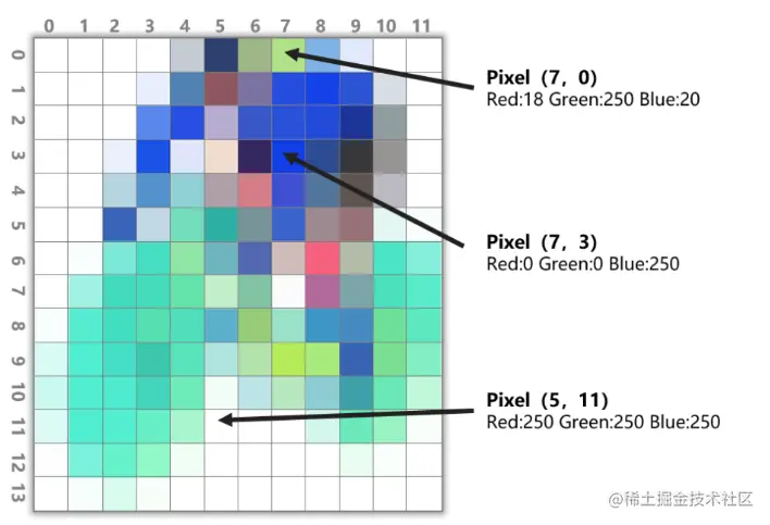 - 通过readPixelsToBuffer接口,一次性读取图片中所有的像素点数据,每个像素点数据都包含了RGB通道的分量值(如Red:18、Green:250、Blue:20)。