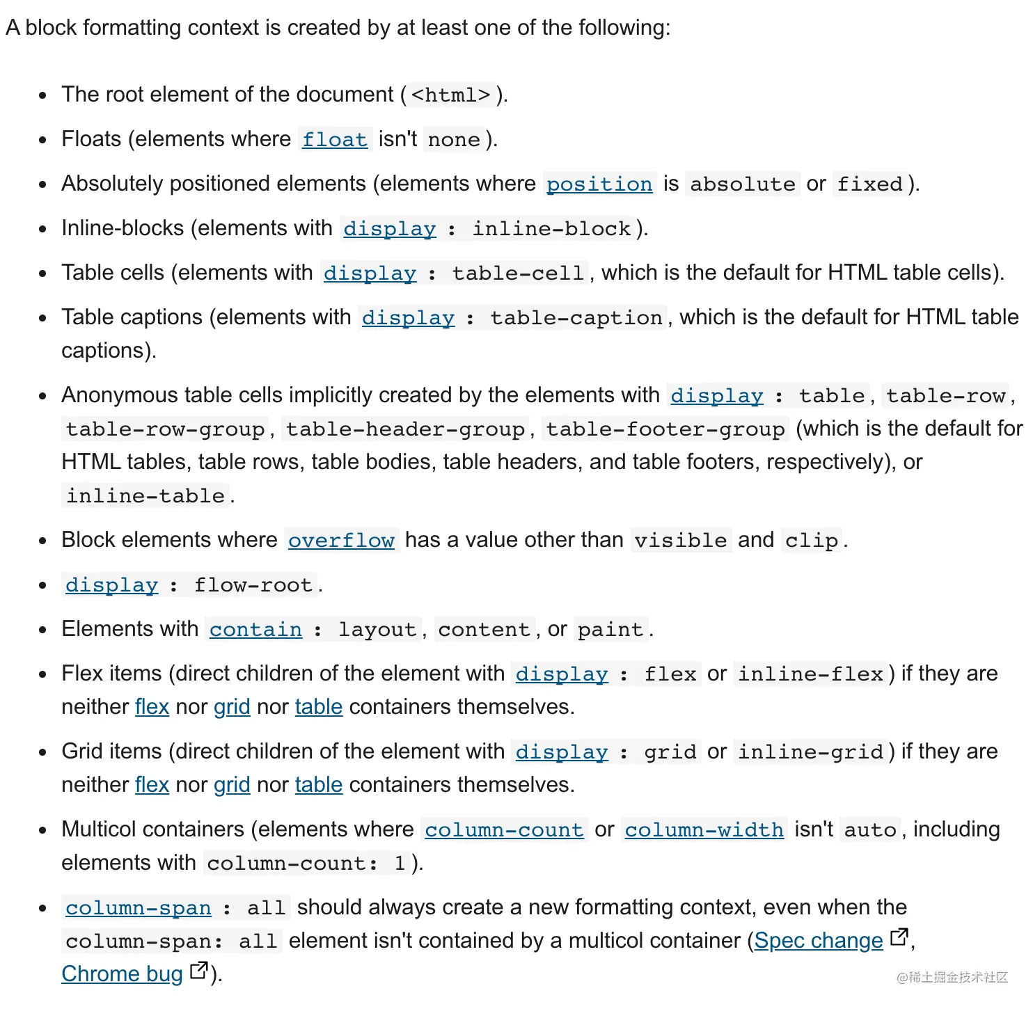 一些 CSS 属性可以强制一个盒子给他们的后代元素生成一个新的格式化上下文,而不是继续使用他们当前所在的格式化上下文。