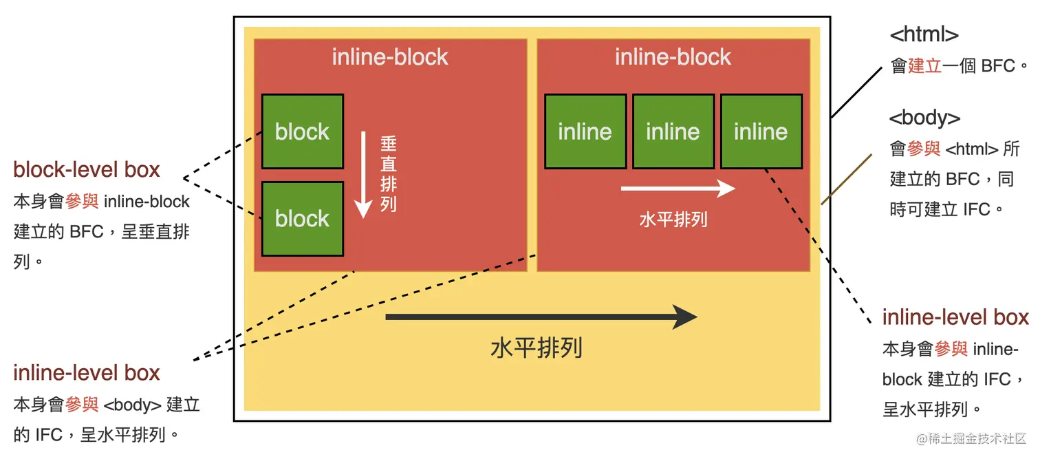 一个 block container box 是一个生成 / 参与 IFC 或者 BFC 上下文的盒子,它一般只包含 inline-level box 的盒子(意味着参与 IFC 布局,后面有介绍),或者只包含 block-level box 的盒子(意味着参与 BFC 布局,后面有介绍)。