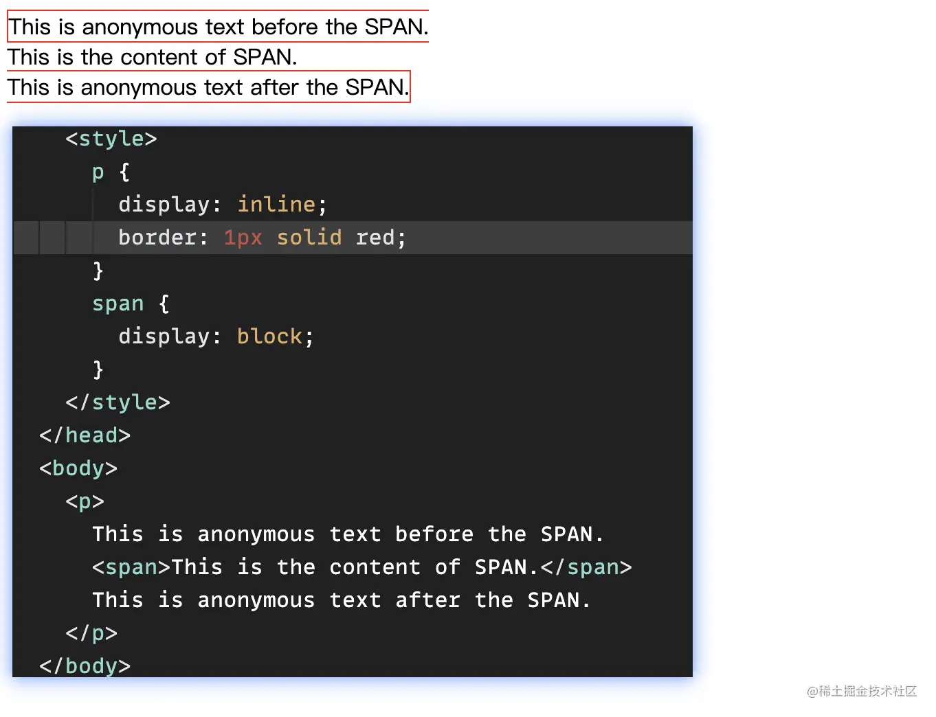 但是一些 CSS 属性还是应用到相应的行内内容和子盒子,如上图的 border 渲染情况