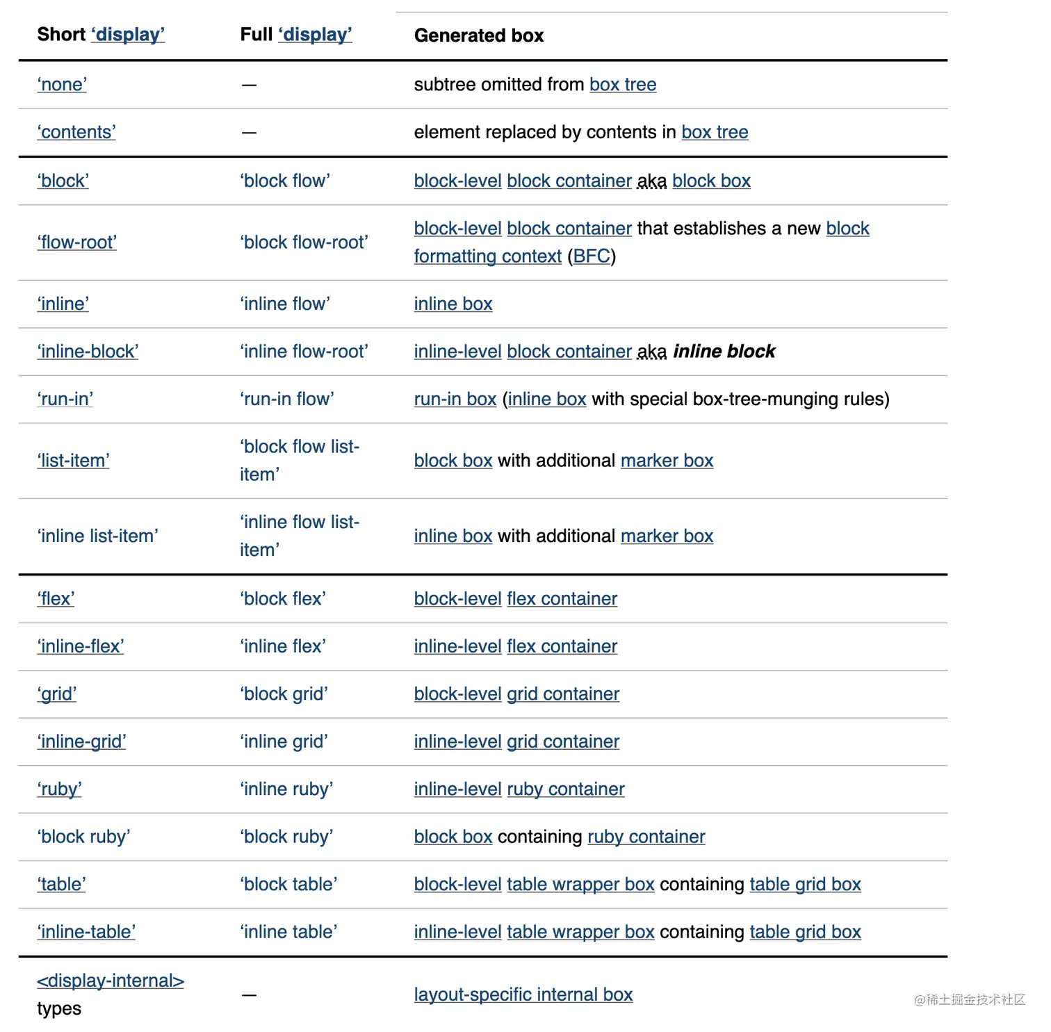 - inner display type:内部 display type,指非替换元素生成的 formatting context 类型(默认 flow、flow-root、table、flex、grid、ruby)