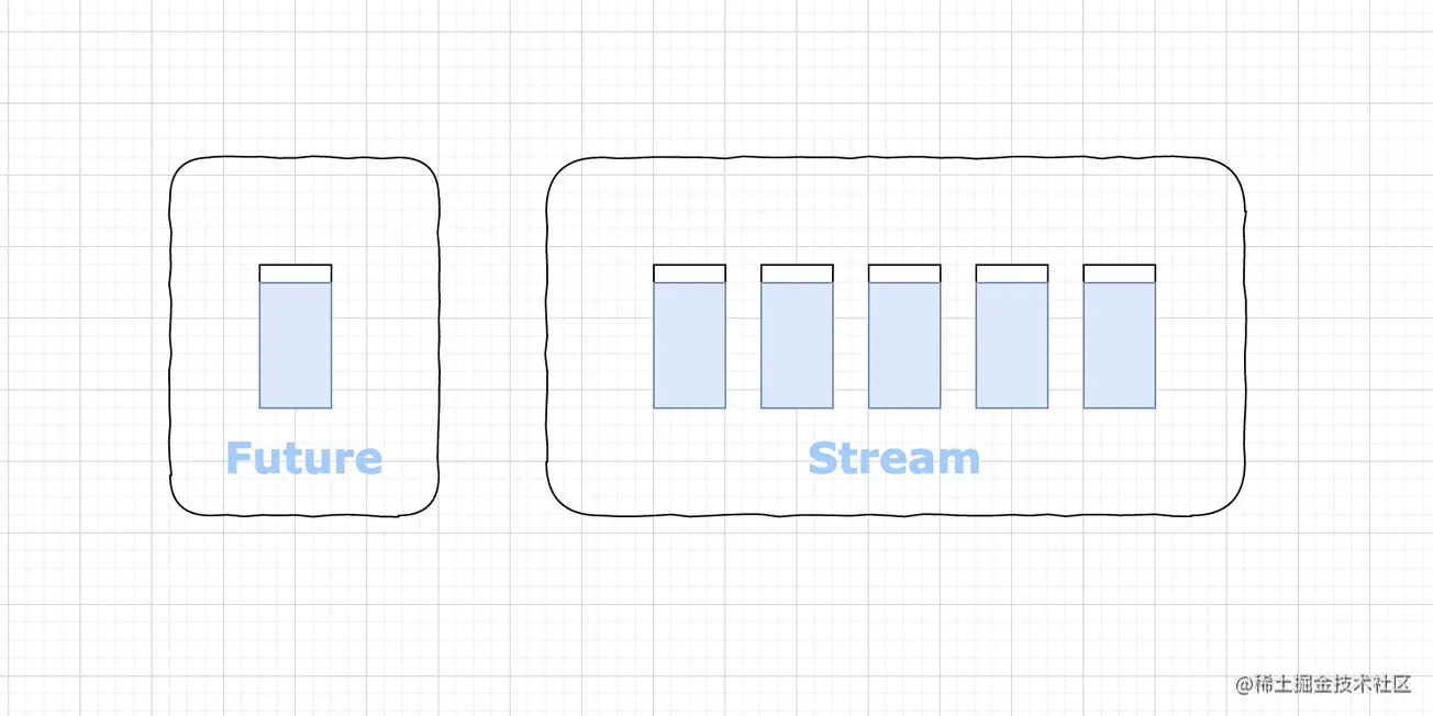 在 Flutter 中有两种处理异步操作的方式 Future 和 Stream,Future 用于处理单个异步操作,Stream 用来处理连续的异步操作。比如往水杯倒水,将一个水杯倒满为一个 Future,连续的将多个水杯倒满就是 Stream。