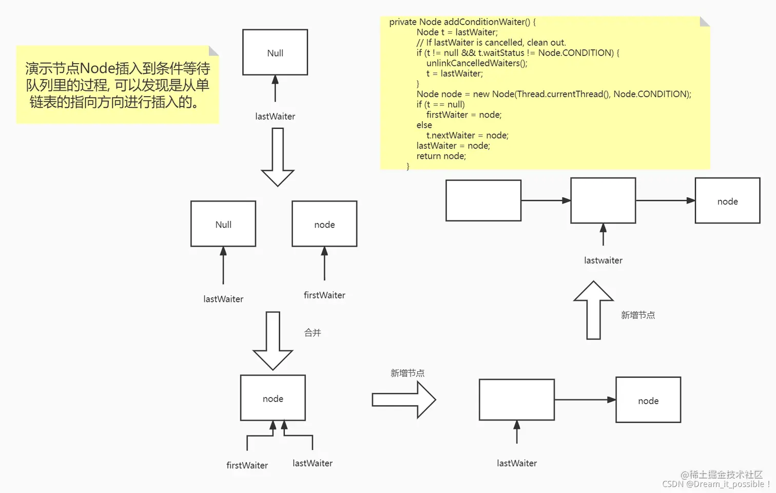 理解了上述的两个概念后,我们可以先看AbstractQueuedSynchronizer里的一个方法: addConditionWaiter(), 该方法的作用是往条件等待队列里添加结点,将当前线程添加到Node里,然后属性为Node.CONDITION, 由于条件等待队列是一个单链表,每次插入结点从队尾插入,每次最后的赋值是lastWaiter.next=node,因此是从单链表的指向方向插入一个新的结点到条件等待队列里。