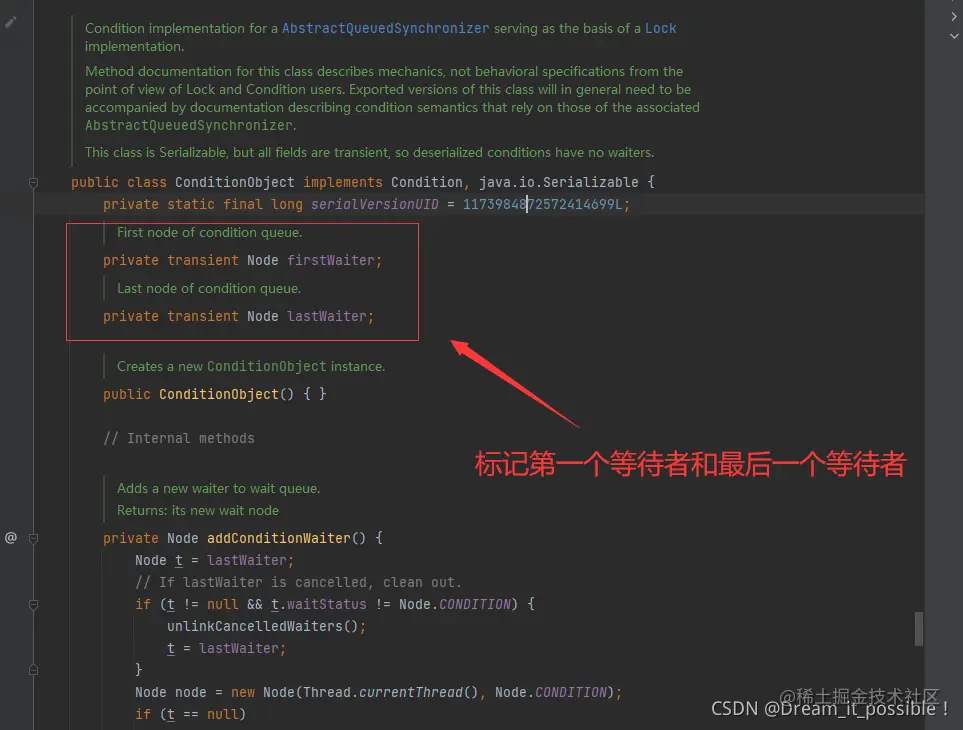 ConditionObject 是AbstractQueuedSynchronizer类里的一个内部类, 主要作用是标记一个条件等待队列,也是利用Node节点来实现,不过条件等待队列里使用的单链表结构 。