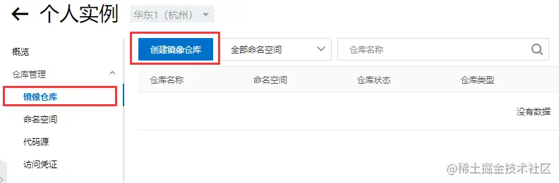 然后点击左侧的镜像仓库,创建一个镜像仓库: