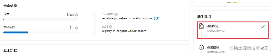然后会要求输入密码,密码在开通容器镜像服务的时候就会让你设置,如果没有设置密码,也可以在页面右侧的新手引导中点击访问凭证进行设置: