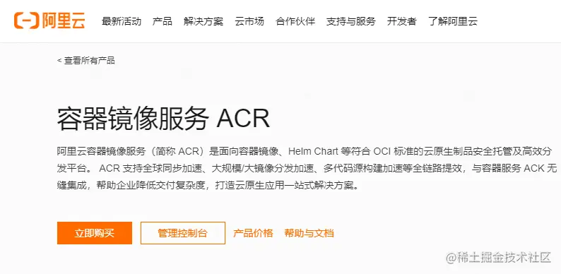 这里以阿里云为例,我们将刚才构建的镜像上传至阿里云的镜像服务器中,首先登录阿里云,搜索 容器镜像服务 并开通: