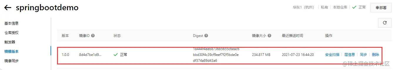 此时点击镜像版本查看一下镜像是否成功上传了: