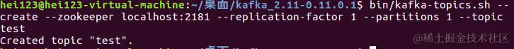 bin/kafka-topics.sh --create --zookeeper localhost:2181 --replication-factor 1 --partitions 1 --topic``test
