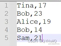 这里会对原始的5行数据先按照姓名的ascii值进行字典排序,对于重名的Bob,会对第2行和第4行的两个Bob按照年龄进行二次排序。