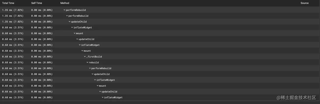 可能大家会说,这部分函数,平时在编程的时候几乎没有使用 🤯 ,但其实他们广泛存在于我们常见的Widget及其属性中。好消息是Flutter Team在过去的更新迭代中已经剔除了非常多的不必要的类似上述的耗时操作 🐳 。所以当大家在自己的timeline中找到类似的耗时操作后,还是可以通过一些Widget的组件源码去分析找到出处,相较以前容易得多。