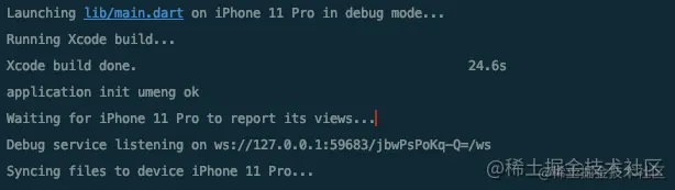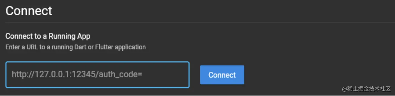 其实上面所需的链接 🔗 地址,就在我们平时运行项目的Log中。大家运行工程,在日志的前几行就可以找到Debug service的地址,就是图中 listening on之后的部分,将该链接填入我们在第二步打开的网页中,就可以进入到我们项目对应的DevTools之中。