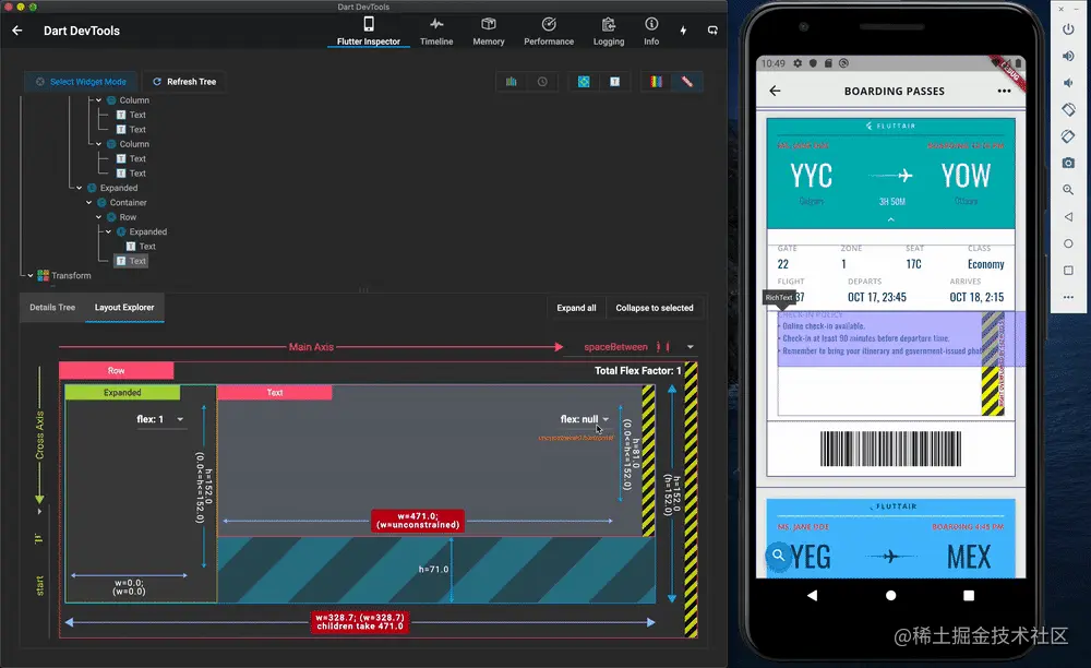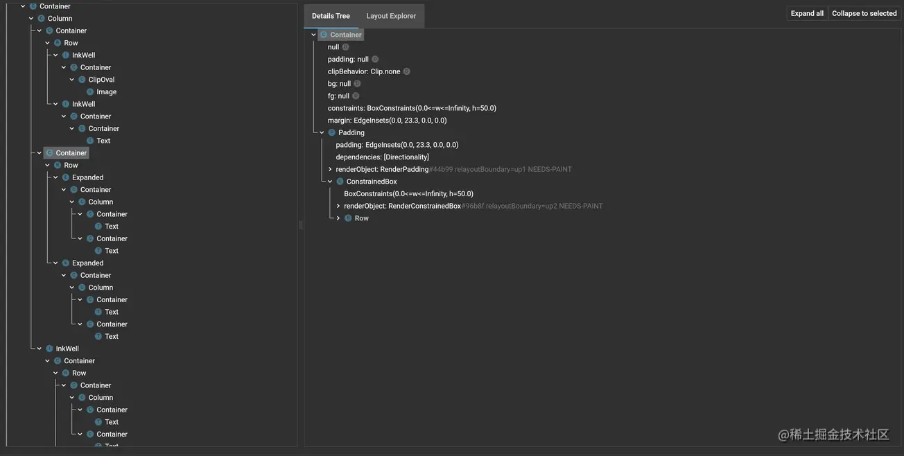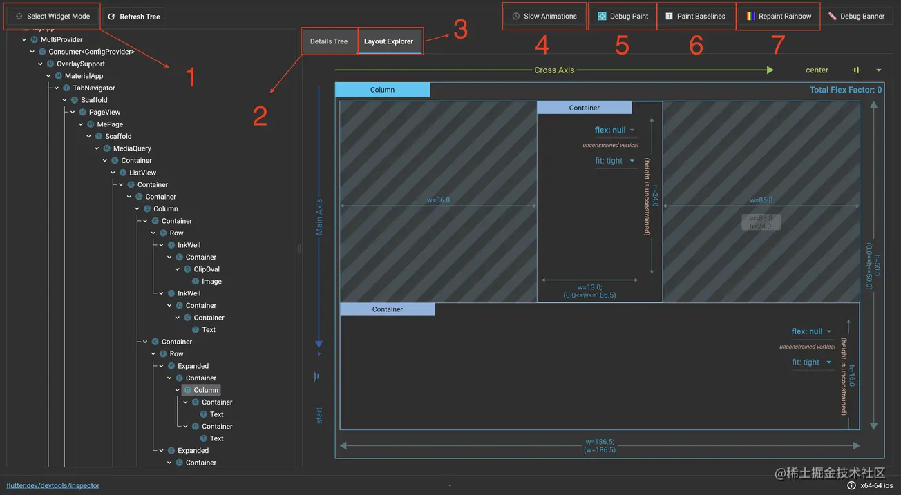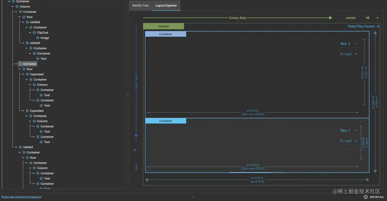 这个就厉害了,是你当前选中节点的布局浏览器。比如大家可以看到,我选中的这个Container下面有包裹的详细结构都有显示出来,包括各个Wiget的边界,甚至给你显示了计算后的高度和宽度 📏 (按照标准的分辨率尺寸)。\