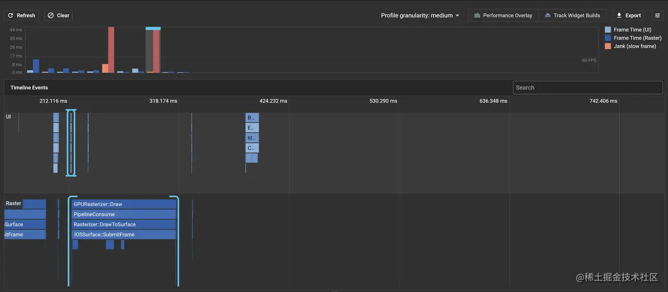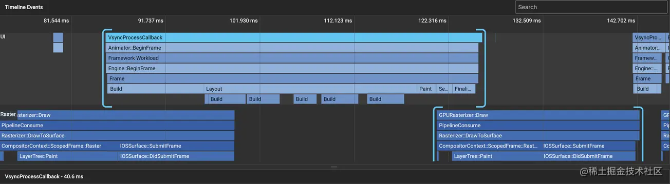 在下图中大家可以看到在Timeline Event中,依然分为了两个部分,上半部分是UI Event,下半部分是Raster Event。在这一阵中,我们可以明显的感觉到的是,我们的UI Event占用了非常长的时间 ⏰ 。为了大家能对整个TimeLine Event的含义有更好的理解,这里引用了官方的一段解释: