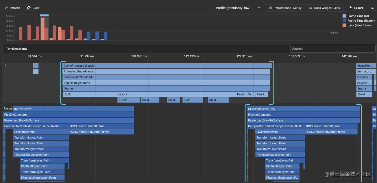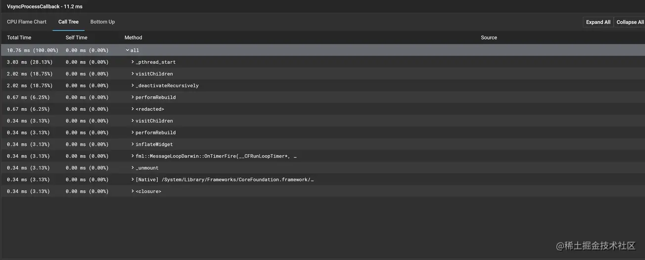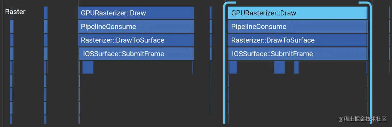 进入这部分timeline之后,这里就是最最最最详细的每一帧的信息了 📌 。你可以用鼠标选中一块区域,在下方就会输出你选中区域的具体函数调用情况。包括函数名称、总耗时、调用次数、每次耗时以及一个可视化的柱状图 📊 占比情况。一目了然。有关GPU部分的函数调用需要各位对Flutter Engine的源码有比较高的理解,才能有针对性的解决问题。其中相关的调用栈非常的复杂。