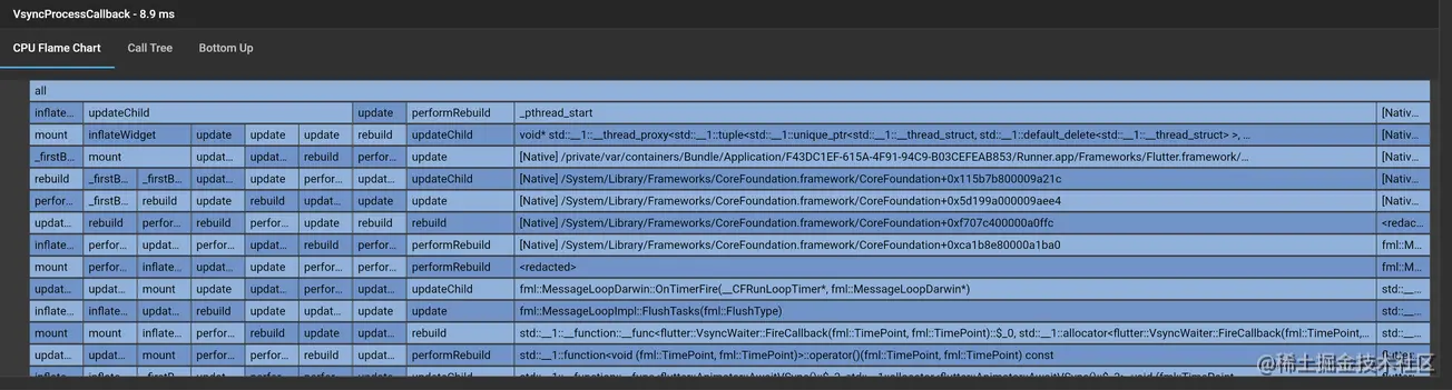 这部分更贴近我们开发者,我们可以详细看到VsyncProgressCallback具体调用了哪些函数,哪些函数是耗时比较久的。大家再结合上面一张图,我们在卡顿这一帧多做的工作,或者说多调用的函数,就是这里的performRebuild,点开函数的具体调用,我们可以发现,这个函数一直在循环调用。没错这里的performRebuild其实就是一个遍历你绘制树 🌲 的过程,说明了你在当前帧,更新了一个庞大的绘制树,并且树上的多个子节点也进行了重新绘制。所以我们应该要排查的就是,我们在界面中的哪个部分集中调用了多个组件的重绘,或者哪部分的view_mode,驱动了这样的一个重绘过程,其中是否有不必要的重绘。以此来提高渲染性能 😆 。