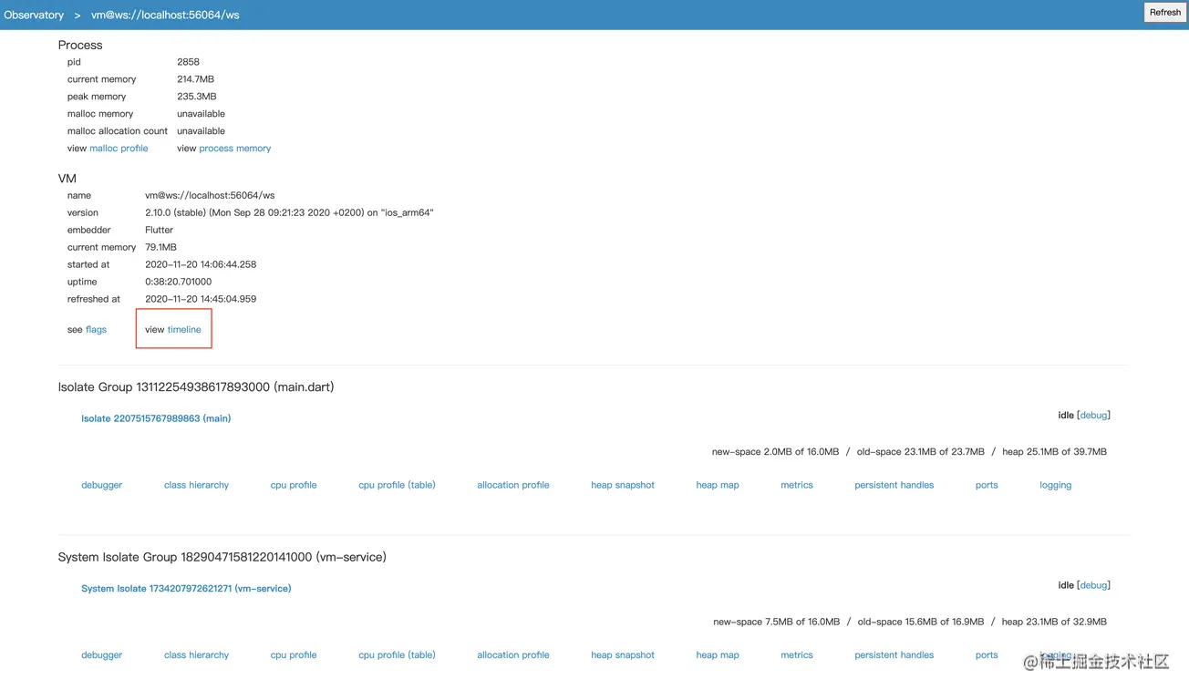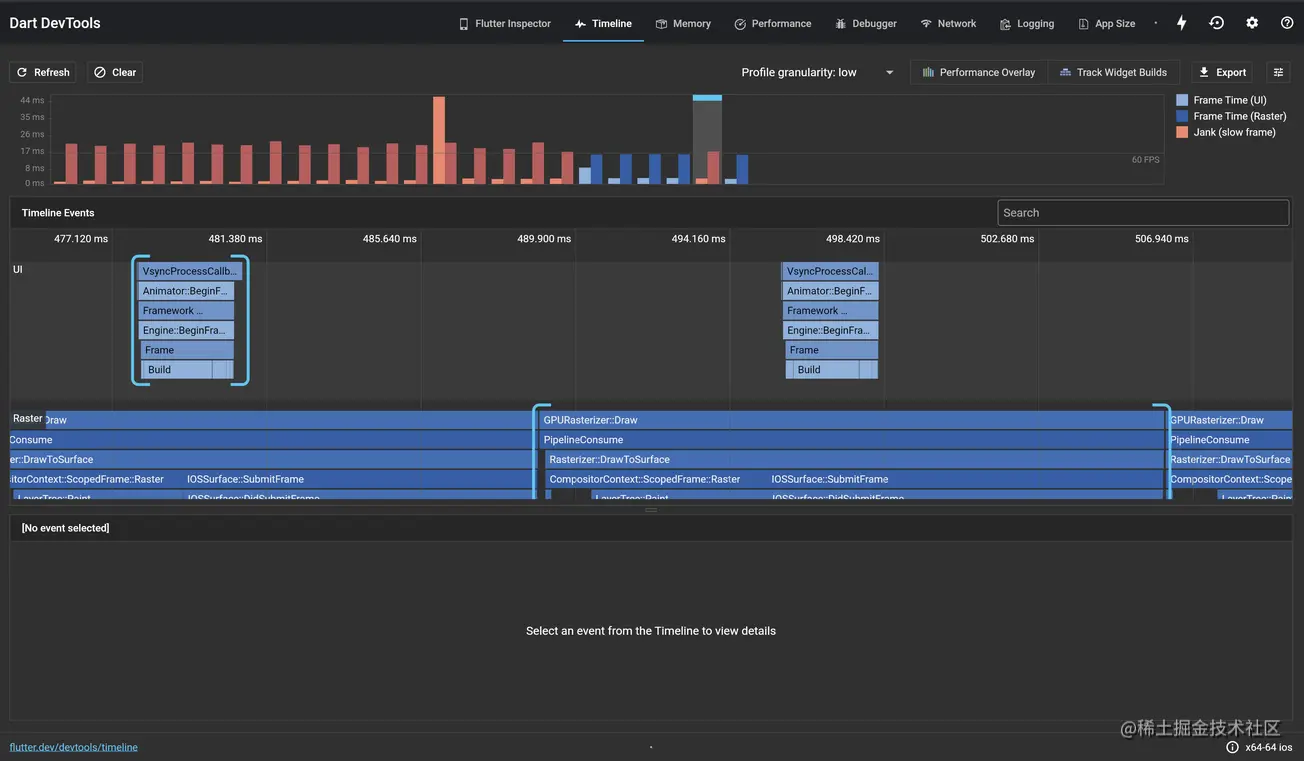 其实在DevTools的Raster视图中,并不能将这部分展示的非常清晰。但是还有一个办法可以深究其原因。大家可以直接打开之前填入DevTools的链接。如果你正在profile模式下运行,你的log中就可以找到这个链接 🔗 。