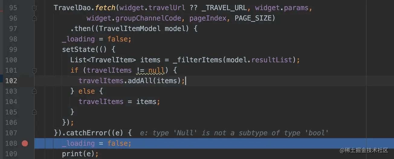- 如果控制台没有出入具体的代码行数,则可以通过debug方式在代码的catch或catchError节点下打个断点,然后当查看catch中具体的报错信息,如: