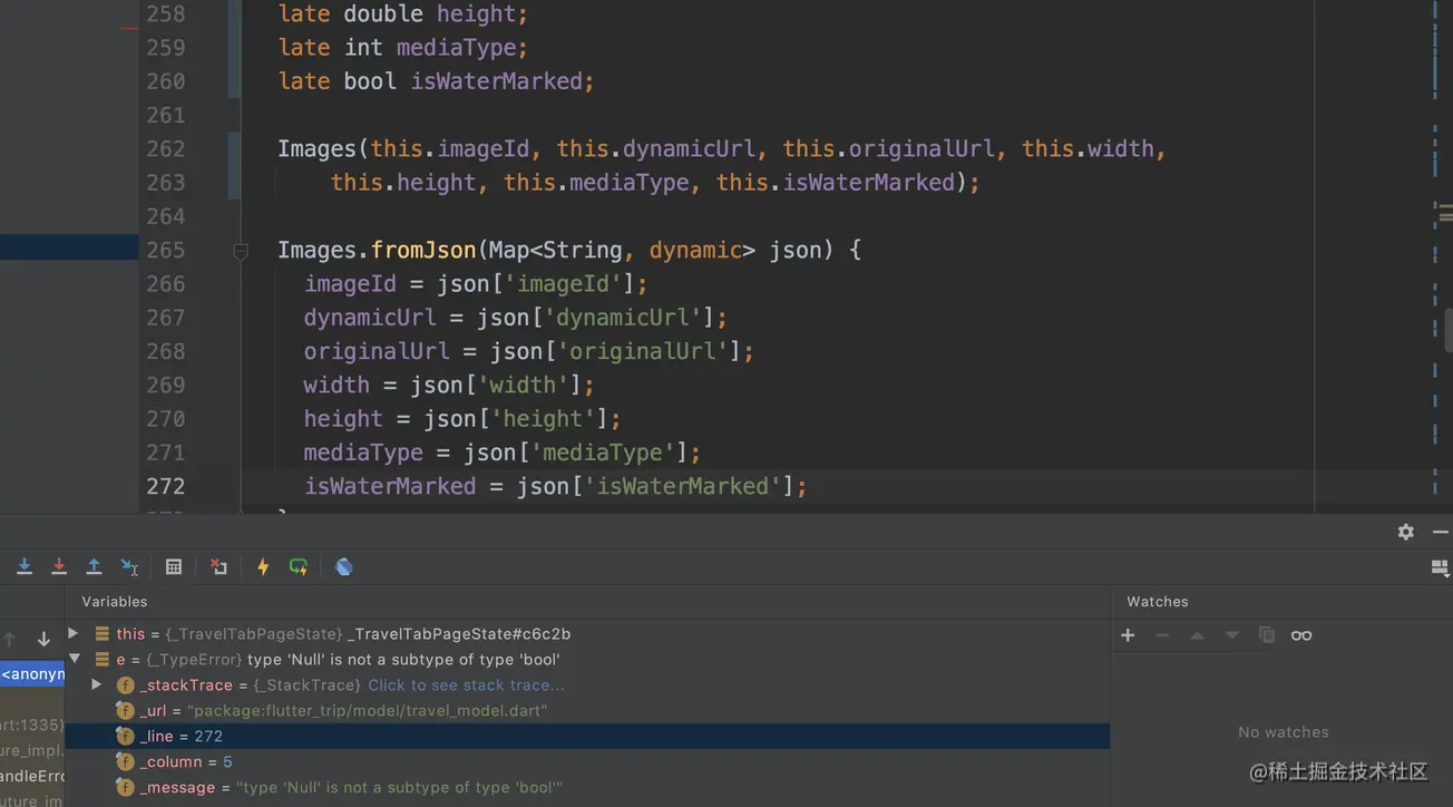 package:flutter_trip/model/travel_model.dart文件的第272行- 查看272行发现是isWaterMarked字段一个不能为空的字段,接收到了一个null值