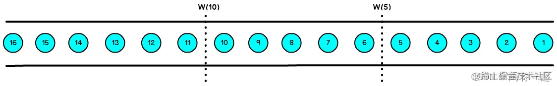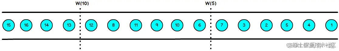 上图中,我们设置的允许最大延迟到达时间为2s,所以时间戳为7s的事件对应的Watermark是5s,时间戳为12s的事件的Watermark是10s,如果我们的窗口1是1s5s,窗口2是6s10s,那么时间戳为7s的事件到达时的Watermarker恰好触发窗口1,时间戳为12s的事件到达时的Watermark恰好触发窗口2。