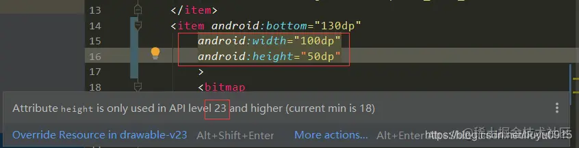 1)系统适配。标签在6.0及以上才有android:width height属性,所以,要兼容6.0以下系统的话,解决方法有二:一、不能使用width height等属性,直接使用图片自适应宽高,如上述代码中的写法,这种会根据图片资源的尺寸和资源所在的目录,这种方法需要注意图片资源的尺寸,最好多切几套图,做到高保真;二、在drawable-v23和drawable两个目录下分别创建背景图的资源,在6.0及以上使用width height属性,6.0以下用图片自适应或用.9图等,这种方式也需要注意,像这种背景图,应用到的尺寸一般也是很大的,dp并不适合大尺寸适配,因此,使用width height属性和dp并不能做到与设计图一致,但是可以通过autoSize的适配方法来设置宽高,达到与设计图一致。