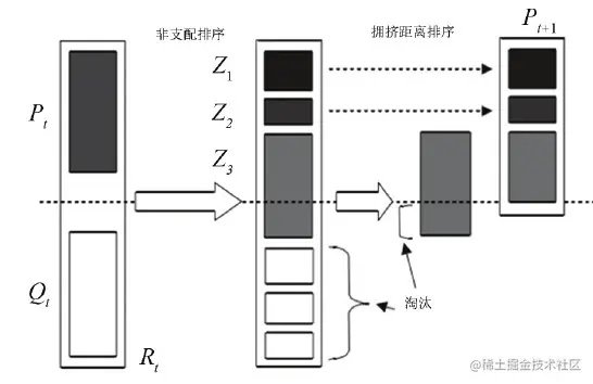- 对分好等级的非支配解集进行拥挤距离排序,根据适应度高低得到前 N 个解,构成下一次迭代的父代种群