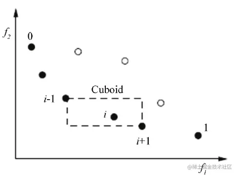 - 每个个体的拥挤距离是通过计算与其相邻的两个个体在每个子目标函数上的距离差之和来求取。 ,即下图中虚线四边形的长和宽之和。