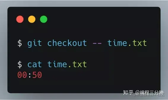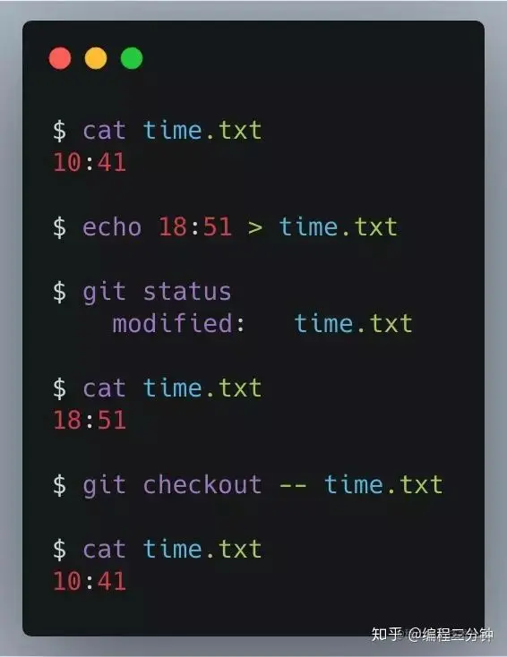 time.txt的内容,可以status看到他发生了变化 git checkout -- time.txt, 取消这次在工作区的修改,如果他已经被add加到了暂存区,那么这个命令就没有用了,他的意思是取消本次在工作区的修改,去上一次保存的地方。如果没有add就回到和版本库一样的状态;如果已经加到了暂存区,又做了修改,那么就回加到暂存区后的状态