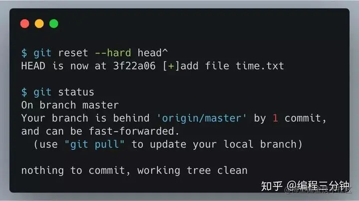 git status查看现在的工作区情况,提示Your branch is behind 'origin/master' by 1 commit,代表成功表了上一次的提示状态 nothing to commit, working tree clean代表这次的修改全没了,清理的算是一个彻底。如果还想找回来怎么办,我们还真是有办法让你找回来的,以后的推送救命的后悔药会详细讲述。
