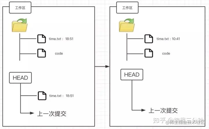 正常我们想达到上图的效果,宝贵的代码放回到暂存区,如果我们是想直接不要了这次commit的全部内容的任何修改那就把git reset --soft head^改成git reset --hard head^,这样你本地修改就彻底丢掉了(一定要小心啊,不然代码白写了),如果真用了想找回来怎么办?我们后面【救命的后悔药】一节会和大家详细讨论。