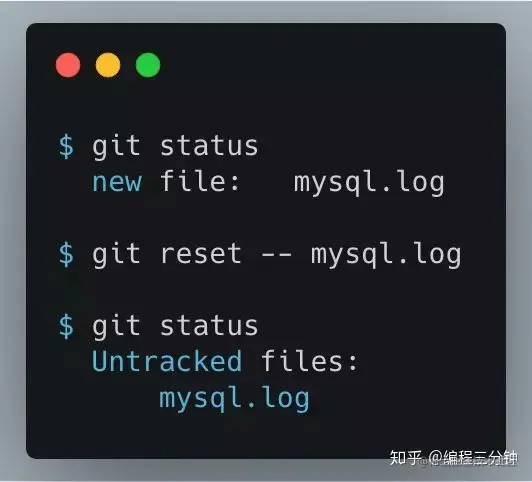 git status查看暂存区,里面有一个mysql.log被放进去了git reset -- mysql.log把mysql.log取出来git status可以看到真的取出来了 然后如果不要想这个文件的话再rm掉就好啦,但是如果这些文件每次自动生成都要用这种方式取出暂存区真的好累,我们可以用 git忽略不想提交的文件(后续技巧篇详细描述)